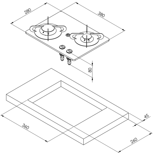 Abm. l x b x t 380x280x80mm