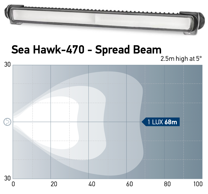 Sea Hawk 470 Diffus Beam: Dient als ausgezeichneter Flutlichtscheinwerfer für den unmittelbaren Bereich. Es ist auch ein hocheffektiver Ersatz für Leuchtstoffröhren aufgrund seiner breiten und gleichmäßigen Lichtverteilung.