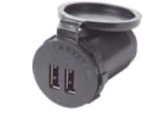 USB-Doppel - Ladesteckdose 12 V / 24 V. Frontseitige Gummikappe als Spritzwasserschutz.