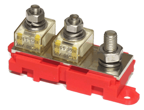 PLUS-Sicherungschiene für 2x Bolzensicherungen SHB. Strombelastbarkeit 250 A, max. Sicherung 200 A. Zuleitungsbolzen M10, Sicherungsbolzen M8.
