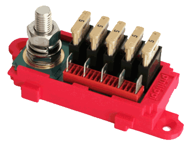 Sicherungsblock für 5 KFZ Sicherungen oder Schutzschalter 1610. Strombelastbarkeit Gesamt 30 A, max. Sicherung 20 A.