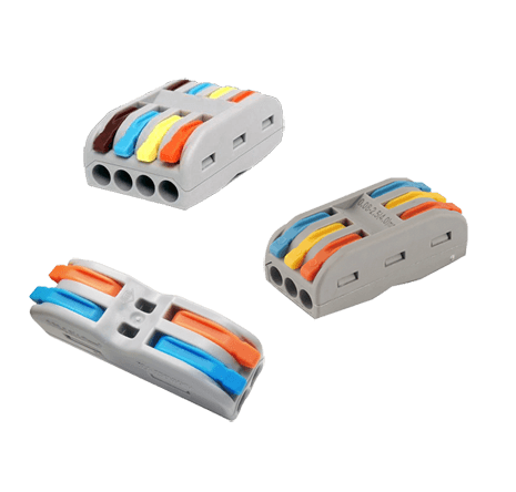 Zweiseitige farbcodierte Hebelklemmen zur einfachen Verlängerung und Verzweigung von Leitungen.
