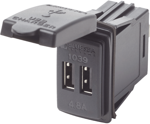 USB Doppel-Ladesteckdose 12 V / 24V passend als Einsatz anstelle eines Schutzschalters E-T-A 3131.                                                                                   Frontseitige Gummikappe als Spritzwasserschutz.