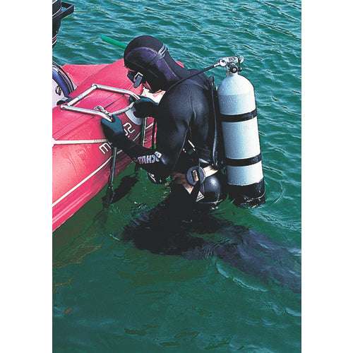 Speziell entwickelt für alle Arten von Schlauchbooten von 3 bis 6 Metern, entweder RIBs oder Boote mit Vollboden. Besteht aus einer versenkten Miniplattform, auf der man sich hinknien und schwere oder unhandliche Ausrüstung (Tauchflasche, Flossen, Pistole...) ablegen kann. Der Taucher kann dann leicht an Bord klettern. Ideal auch, um nach dem Schwimmen wieder an Bord zu kommen.