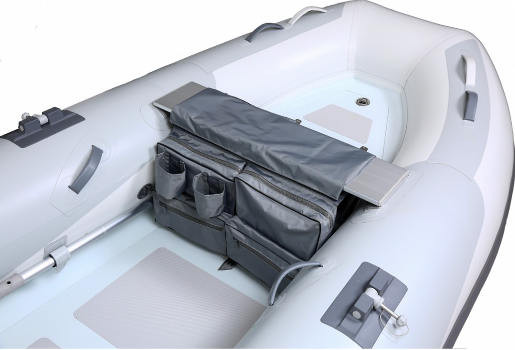 Graue PVC-Satteltasche für RIB, Beiboote und kleine Boote mit einer Sitzbank.