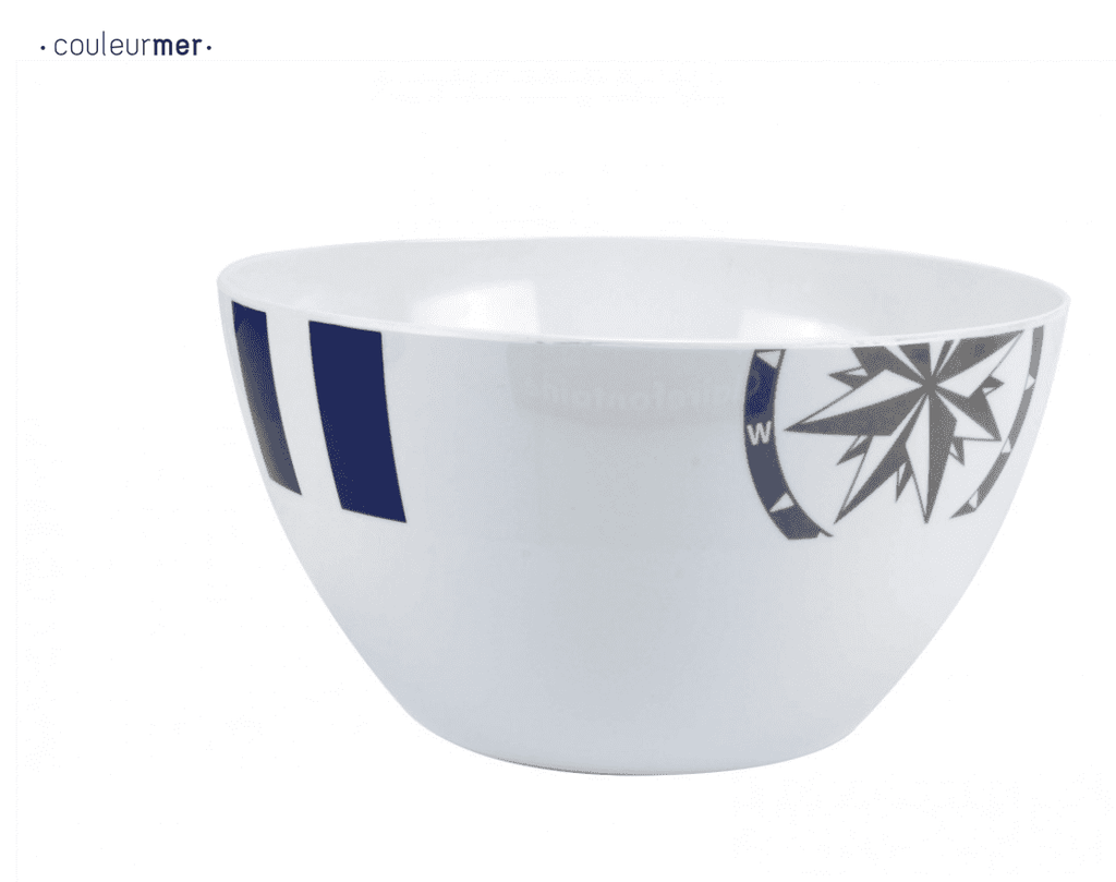 Weißes Geschirr mit grauem und blauem Dekor. Spülmaschinenfest.