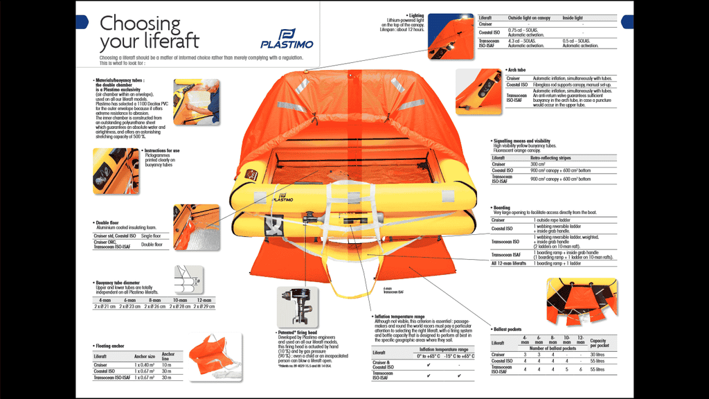 Für Extrembedingungen entwickelt : mehrere große Kentersäcke, großer Treibanker, korrekte Zündung bei -15°C (Klasse A), isolierender Doppelboden, orange fluoreszierendes Dach mit automatisch aufblasbarem Dachbogen, Außenleuchte 4.3 cd, Reflektor und Radarreflektorstreifen.