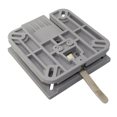 Drehkonsole für Steuersitze aus widerstandsfähigem Kunststoff. Der Sitz kann durch Ziehen der grauen Arretierungslippe abgenommen werden. Durch Ziehen des Metallhebels kann die Dreh-Arretierung gelöst werden (eine Arritierungsposition auf 360°). Kunststoff mit Dreh-Arretierung.