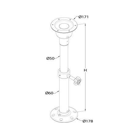 Höhenverstellbares Tischbein und Bodenplatte mit Schraubverbindung aus hochwertigem Aluminium. Tragkraft 25 kg. Die Basisplatte wird nur am Deck verschraubt. Ein Durchbruch wie bei Einstecksystemen ist nicht notwendig.