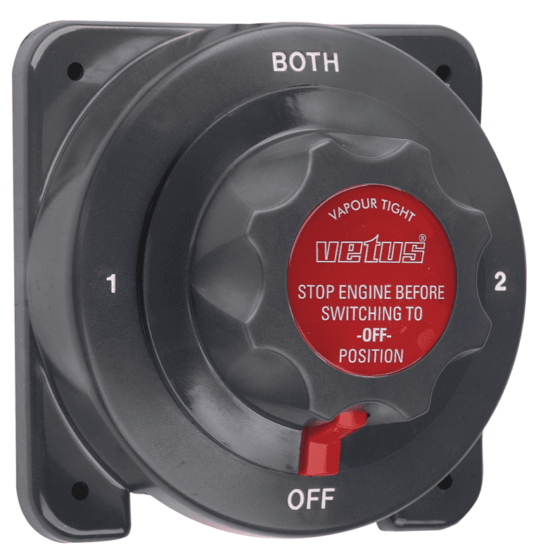 Mit einem roten Verriegelungsknopf versehen, der die Schaltposition angibt und verriegelt und der darüber hinaus ein allzu spontanes Umschalten verhindert (z.B. durch Kinder). Mit dem Batteriewahlschalter hat man jedoch die freie Wahl, welche der Batterien oder ob beide Batterien Strom an die Verbraucher liefern. Normalerweise ist z.B. eine der Batterien die Anlasserbatterie. Wenn diese aber leer oder defekt ist, muss man auch die andere Batterie zum Starten benutzen können. Dabei kommt der VETUS-Schalter zum tragen. Es ist sogar möglich, aus beiden Batterien gleichzeitig zu starten, wenn man den Schalter in Position “both” (beide) schaltet. Mit einem VETUS Batteriewahlschalter könnenn die Start- und Verbraucherbatterien wahlweise benutzt und aufgeladen werden.